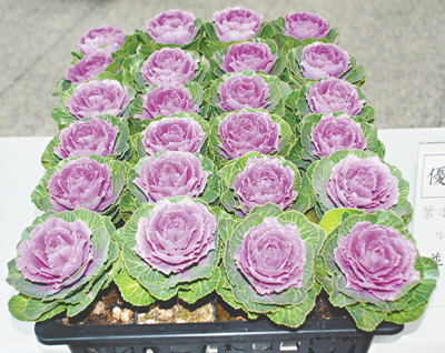並木さんのハボタンはルシールワインという品種で、葉の鮮やかな紫色が特に素晴らしく、枚数やボリュームなども優れた逸品。ルシール系は、比較的新しい品種で高級感を醸し出す葉の光沢が特徴の人気の花だ。出品された作品も品種特性をよく理解し、適切な肥培管理を施したことが伺えた点なども好評価につながった。