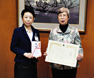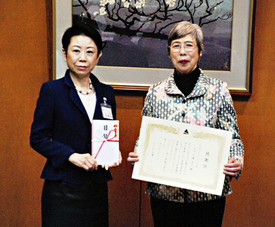写真上/寄付金を受け取った近藤区長と感謝状を授与された大兼会長=区役所で