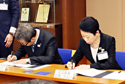 3月23日(月) 、足立区は東京ワーナー観光㈱(渡辺広光社長、平野1-6-14)との間に「災害時における輸送業務等に関する協定」を結んだ。