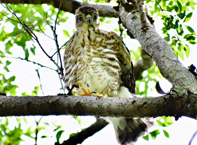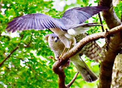 6月30日(火)、そのヒナが、イチョウの木から外に出た。あと2羽もすぐに続き、最後の1羽も巣立っていった。なお、先月号6面で紹介した、別の公園のツミの若鳥ペアは、アクシデントが発生した模様で、その後行方不明になった。その巣にはオナガがちゃっかり入り込んだが、オナガがツミを襲うことはなく、むしろ守り役。