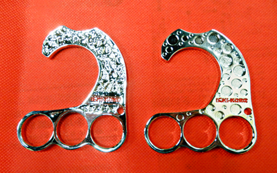 2人は、宮城2丁目にある「坂本技研製作所」の坂本剛代表(59)と妻の千恵子さん(49)。今回製造した商品(写真)は、電車やバスのつり革につかまる時や、エレベーターや自販機のボタン押しなどに使えるアイディアグッズ。4月頃から市場に出たヨーロッパ製の手握りフックではなく、3本の指が入る形状にして使用時の安定感がアップしているのがミソ。