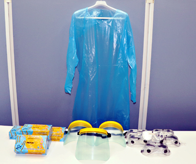 支援物資は、①フェイスシールド約900枚②防護衣約300枚③ゴーグル約400個④ゴム手袋約8000枚で、大小23個の段ボールに詰められていた。
