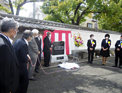 建立された記念碑を囲む皆さん。碑の左は木嶋会長(相川謹之助さん撮影)