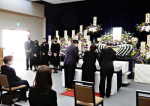 写真/故沖山氏にカーネーションを捧げて最後のお別れをする参列者たち=東冠メモリアル綾瀬で