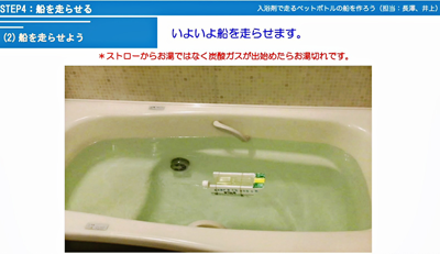 写真上/「入浴剤を使ってペットボトルの船を走らせよう」の動画のワンシーン