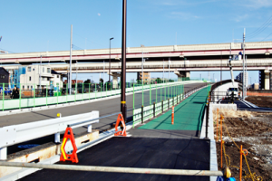 この橋は、補助258号線、通称環七北通りの六町1-15と加平2-22間を結ぶ綾瀬川に架かっている。橋は平成24年(2012)に完成済みだったが、六町側の取り付け道路整備工事のため、人と自転車のみが通れる状態だった。今回、車が通れるようになることで、環七通りの加平橋の渋滞緩和や防災機能の向上が期待されている。