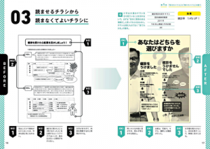例えば第1章の「『伝えたいこと』と『知りたいこと』は違う」では、よく作る側が陥りがちな詰め込み過ぎて伝わりにくくなることを指摘し、「チラシは読むものではなく『見てわかる』が基本」とズバリ説かれている。