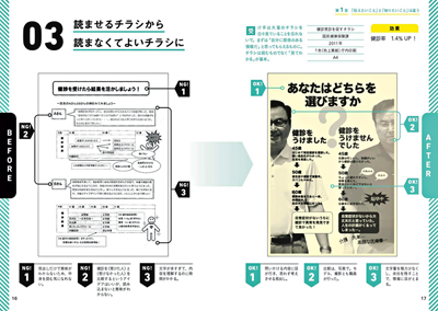 この本は「ビフォーアフター」の名の通り、足立区で作成されたチラシの実例約50点を、改革前と後を比較して掲載。その違いは一目瞭然で、「これが商業デザインを知るプロの力か!」と驚かされる。