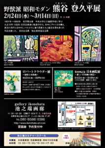 3月14日(日)まで。午前11時半~午後6時(日曜午後5時まで。月・火休館)。無料。1901年~1968年。谷中にアトリエを構え、谷中モンパルナスに集う画家たちと交流を深め、多くの作品を創作。