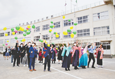 写真/大空へバルーンを飛ばす子どもたち=江北小で