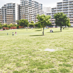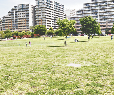 同公園は区内最大級の芝生広場を持つ公園で、アスレチックやすべり台などの遊具もある。休日には親子で遊ぶ姿がよく見られる。バラを見ながら遊べる公園としてはもってこいの場所だ。