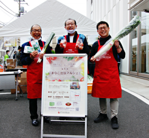 この企画は、日用雑貨品の製造・販売会社の㈱シービージャパン(梅島1-36-9)の青木宏会長(73)が趣味のアユ釣りで訪れていた真名子の魅力に引かれ、地元の人たちと交流する中で自動車会社を営む湯澤孝典さん(36)から過疎化が進んでいるので地域活性化をしたいという思いを聞いたことがきっかけで、取引のある同信金に相談して開催が決まった。真名子の特産であるニラ(50円)や県外には出回らないイチゴ「とちあいか」(1パック750円)などが多数並び、購入者からは「今回初めて真名子という地域を知った」「コロナが落ち着いたら行って見たい」と大好評だった。同イベントは収益金の一部が、こども食堂支援金として活用される。