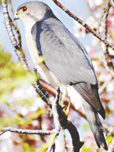 【メモ】ツミは、シベリア南部、モンゴル、中国、日本などに分布しているタカ科の鳥。日本で最小の猛禽類。猛禽類とは、他の動物を捕食する鳥のことで、タカやハヤブサ、フクロウの仲間。鋭い爪とくちばしを持つのが特徴だ。大きさはオスが全長約27㎝、メスが約30㎝で、羽を広げた状態(翼開長)では50~60㎝にもなる。眼の色が赤いのがオス、黄色がメス。一度に産む卵の数は2~5個で、4~5月に産卵。卵はメスが温め、約30日で孵化、孵化後約30日で巣立つ。