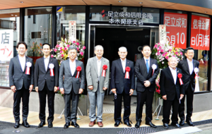 テープカットには、同信金の土屋武司理事長、関寺久夫関原二丁目南町会会長、後藤誠之助関原不動商店街理事長、総代の青山幸弘氏、野村元治氏らが参加。