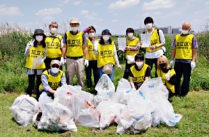 次に荒川河川敷に移動し、実際に河川に流れ着いたゴミ拾いを行った。多くのペットボトルやどこから来たのか不明なカラーコーン、ビニール袋など様々なゴミを回収した。