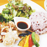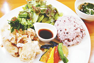 ランチは6種類。特にオススメなのが3食限定の「牛タン和善」(1390円)と女性に好評の「野菜たっぷりプレート」(950円)。プレートは唐揚げおろしポンズ、生野菜、季節野菜の素揚げ、十六穀米、十種野菜のスープ、デザートが付いていて、ボリュームがある中でも健康を考えられた料理になっている。