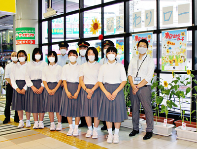 7月15日(木)には、同校の生徒会で担当する6人が梅島駅を訪問。5月から10基のプランターで育てたヒマワリ30本を駅構内に並べた。これには、駅職員らも喜んでお手伝い。同時に、生徒たちが描いた「笑顔があふれる街に」との思いのこもったポスターも張り出された。同校では令和2年に、東日本大震災を忘れないために自分たちができることとして、「福島ひまわり里親プロジェクト」から震災復興のシンボルであるヒマワリの種を購入。同校がヒマワリの『里親』となって育てている。