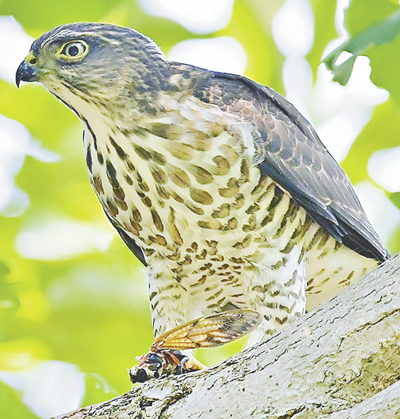 例年のように、オス親が、スズメなどをエサとして捕ってきてはメス親に渡し、ヒナを育てた結果、ヒナは6月下旬には巣の周りを飛び回るまでに成長。いつもだと、成長したヒナは、親からのエサのほかに、自分でもセミなどを補食している。今年はセミがなかなか姿を現さないため、7月中旬までほとんど親のエサを頼りにしていた。梅雨明け後、ようやく鳴き始めたセミを、ヒナがゲットする姿が見られた。
