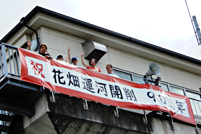 埼玉県など東京近郊の農村地帯と都心をつなぐ舟運の利便化のため、1931年(昭和6年)に運河として開削された花畑運河。同運河が今年開削90年を迎えることから、この「歴史的運河」を残そうと運動している人たちが、その存在と価値を伝えようと、9月17日(金)、中川に接する高さ約20mある水門の頂上テラスの柵に「祝 花畑運河開削 90周年」の横断幕を設置した。