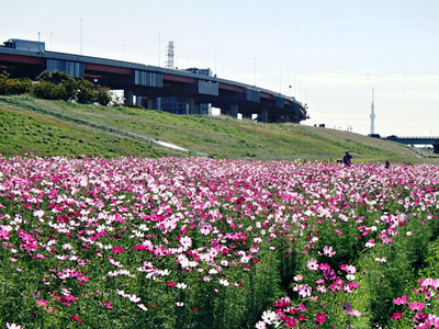 鹿浜・都市農業公園先の荒川河川敷にある2200㎡もの広大な特設花壇に咲くコスモスが、これから見ごろを迎える。ここは、花壇越しにスカイツリーも望める都内でも有数の撮影スポット。ぜひ訪れてみよう。