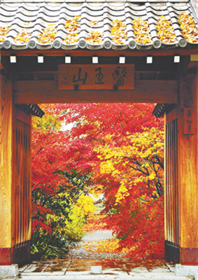 「80種のモミジが山門からトンネルを作り、錦絵のような美しさ」と言われて有名な薬師寺(伊興5-4-3)。通称「ツバキとモミジのお寺」とも呼ばれている。