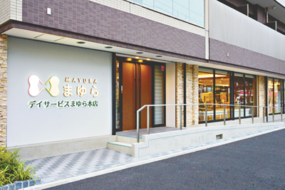 尾竹橋通り沿いに、今年5月に出来た「デイサービスまゆら本店」(西竹の塚2-12-16、TEL5647・9511)。通り沿いの大きな窓からは中の様子が見え、全員が笑顔で楽しく過ごす様子が伝わってくる。