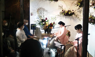 10月4日(月)までの前半は「書道と竹灯り展~竹取物語」と題し、竹あかりを灯した幻想的な雰囲気の中で3日に分けて津軽三味線、雅楽、薩摩琵琶のライブが行われ、同7日からの後半は竹を生け花に替え、華やいだ空間となった。竹と花の室内装飾は、足立区生まれの華道家・釆女栖佳さんが担当、背後の壁面にろじこや代表のなすご龍芳さんが書をしたためた。10日(日)の箏のライブは藤重奈那子さん、町田夢子さんが2台の箏で、お馴染みの秋の歌や古今和歌集を歌詞にした曲など7曲を演奏。聴衆は華やかな音色に静かに聞き入り、情感溢れるひと時を楽しんだ。