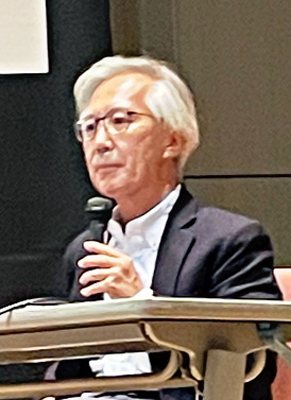 写真上/講演する中川教授=千住の天空劇場で