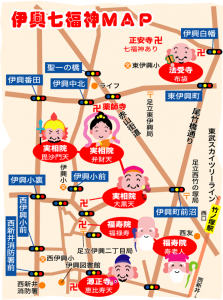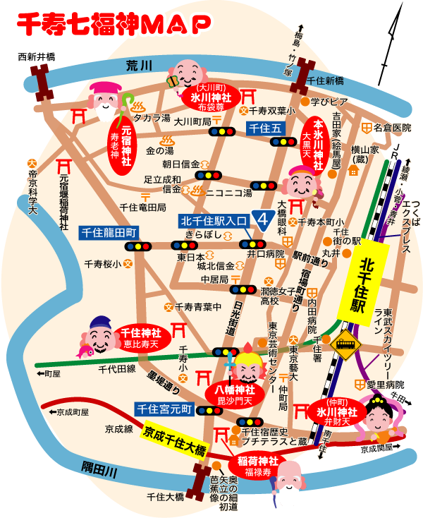 【千寿七福神】「千住宿 千寿七福神めぐり」は、地図のように北千住駅西口を降りてから時計回り(右回り)でも反時計回り(左回り)でもOK。時計回りで行くと、弁財天(愛敬と縁結びの神)の氷川神社(千住仲町)、福禄寿(招徳人望の神)の稲荷神社(千住河原町)と来て国道4号線を渡り、毘沙門天(融通招徳の神)の八幡神社(千住宮元町)、恵比寿天(商売繁盛の神)の千住神社(千住宮元町)から少し離れた寿老神(長寿延命の神)の元宿神社(千住元町)、布袋尊(笑門来福の神)の氷川神社(千住大川町)と歩き、大黒天(福徳開運の神)の千住本氷川神社(千住3丁目)でゴール。約6㎞、お参りの時間も入れてゆっくり歩き、約3時間のコース。参拝は元旦~7日(金)午前9時~午後4時。各神社で色紙宝船(2000円)を求め、御朱印(各200円)を納める。無料の子ども用スタンプラリーもあり。ほかに、七福神のご神体(1