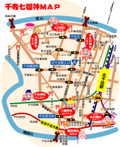 「千住宿 千寿七福神めぐり」は、地図のように北千住駅西口を降りてから時計回り(右回り)でも反時計回り(左回り)でもOK。時計回りで行くと、弁財天(愛敬と縁結びの神)の氷川神社(千住仲町)、福禄寿(招徳人望の神)の稲荷神社(千住河原町)と来て国道4号線を渡り、毘沙門天(融通招徳の神)の八幡神社(千住宮元町)、恵比寿天(商売繁盛の神)の千住神社(千住宮元町)から少し離れた寿老神(長寿延命の神)の元宿神社(千住元町)、布袋尊(笑門来福の神)の氷川神社(千住大川町)と歩き、大黒天(福徳開運の神)の千住本氷川神社(千住3丁目)でゴール。約6㎞、お参りの時間も入れてゆっくり歩き、約3時間のコース。参拝は元旦~7日(金)午前9時~午後4時。各神社で色紙宝船(2000円)を求め、御朱印(各200円)を納める。無料の子ども用スタンプラリーもあり。ほかに、七福神のご神体(1