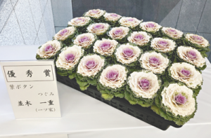 並木さんの葉ボタンは「つぐみ」という品種で、葉の枚数が多く、色合いやボリューム、締まりなどが優秀で、欠点がなく栽培技術と出荷調整技術の高さが日本屈指のレベルと感じる点が好評価につながった。