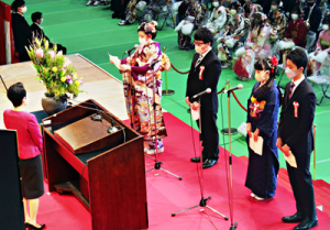 写真上/新成人の誓いを述べる代表4人=東京武道館で