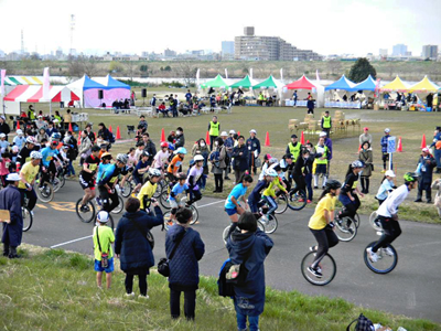 下/一輪車マラソンがスタート!=荒川河川敷で