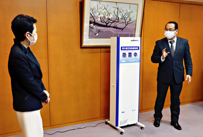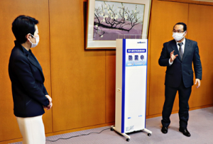 寄贈されたのは、価格が100万円を超える「紫外線空気除菌装置Neo YAMATO」。新型コロナウイルスが紫外線の照射により不活化することを知った同社が開発を行い、昨年9月から商品化した。