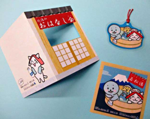下/やよい図書館が作ったおはなし会カード、しおり、特製若松湯シール
