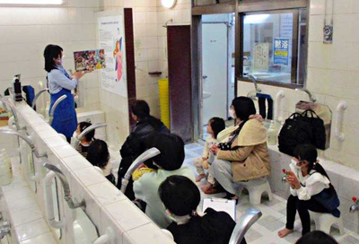 やよい図書館が主催したもので、銭湯での読み聞かせは同館初の試み。募集開始後、すぐに定員満了となったほどで、乳児から小学3年生までの子どもと親の10組が参加した。これまで銭湯に来たことがなかった子もいて、初銭湯に大喜びの様子。やよい図書館のスタッフが風呂にちなんだ本、『パンダ銭湯』『ぷっぺと銭湯おとうさん』『いろいろおふろはいり隊』『もりのおふろ』の4冊を朗読。参加者たちは浴室に並べた椅子に座って聞き入った。『もりのおふろ』の「ごしごししゅっしゅ」の部分はみんなの掛け声が響き、銭湯ならではの臨場感が楽しめるものとなった。