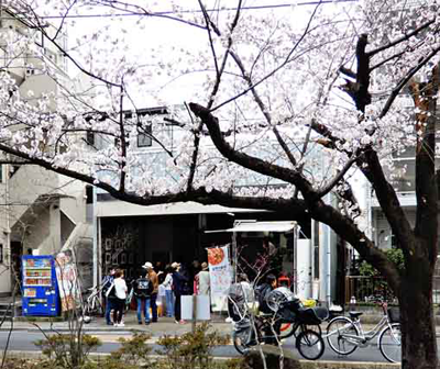 ソメイヨシノが満開になった3月27日(日)、葛西用水沿いの大谷田5-19-14にある倉庫で、「心と身体を元気にする糀・米の『食』と食を楽しくする『もの』に出会うマルシェ」が開催され、花見客などが立ち寄って賑わった。