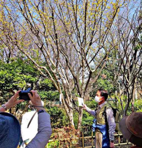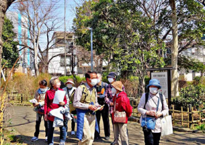 年間10回ほど足立区内と周辺の公園、河川敷、庭園、鎮守の森などを歩き、四季折々の草花や樹木の生態や人との関わり、文化などの説明を聞きながらめぐる「あだち道草の会」(萩原循代表)が3月12日(土)に行われ、柳原千草園を歩いた。