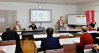 「花畑運河の今昔、そして未来」と題して行われたこのイベントには、会場に47人、WEBで28人が参加。最初に、三井代表がスライドを使いながら「花畑川の歴史と文化」について説明。続いて講演では、竹村公太郎日本水フォーラム代表理事が、江戸幕府を開いた徳川家康の関東開発の話から始め「150年ほど前の江戸には、多数の運河があったが、その運河は共同体の形成に大きく貢献した」と話した。