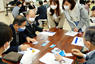 写真上/パズルゲームで地域の人たちと交流する学生=桜花亭で