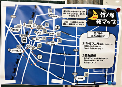 中・下/調査結果を元に学生が作製した竹ノ塚駅前マップ。昼と夜で2面性があることから2パターン作った