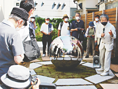 写真/除幕された九条の碑。上部には「9」の文字。集まった人々の姿が球体に映っている