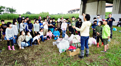 初めに、三井理事長が「年間910万トンものプラスチックゴミが世界の海に流出していて、最近では、プラスチックが小さな粒になって魚のおなかに入っていたりしています。世界では2050年までに海洋プラスチックごみ汚染をゼロにまで削減することを目指すと言っていますが、果たしてどうやったらできるのかということを、ゴミを拾いながら考えていってほしいです」と述べた。ネイチャー体操が行われた後、児童たちはごみ拾いに繰り出した。グループごとに川べりに立ち、ボラが群れて泳いでいる様子やイグサ、ヒメガマ、カマキリなどを観察したり、干満の差があることの説明を受けたりした。7人のPTAボランティアの見守りのもと、1時間ほど自由に広がってごみ拾いを行ない、橋の下に集めて分別・集計を行った。