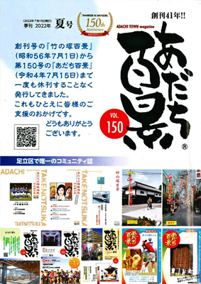 41年前の昭和56(1981)年7月に足立の季刊(年4回発行)のタウン誌「竹の塚百景」の創刊号が発行された。あれから41年、途中、名前を「あだち百景」に変えて発行を続け、この7月に記念の150号を出し、再び注目を集めている。