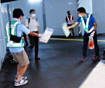「自分たちの地域と子どもたちは自分たちが守る!」との思いで、8月26日(金)夜、東武線竹ノ塚駅改札前で、区立第十四中学校や栗原北小学校などの父親たち15人が、チラシなどを配って防犯活動を展開した。