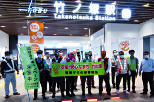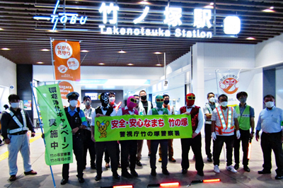 この日の活動は、区や竹の塚警察署の協力で行われたが、地域の会社「丸鈴」の社員で作る「スポンジ実験隊」がゴレンジャーまがいの派手な衣装を着て参加、PRを盛り上げた。竹ノ塚駅周辺地区では、まず区立第十四中学校の「おやじの会」が防犯パトロールを展開。その熱心さに近隣の栗原北小学校の「お父さんの会」などが賛同し、半年前から月に2回以上の合同パトロールを行うなど活動の輪が広がっている。