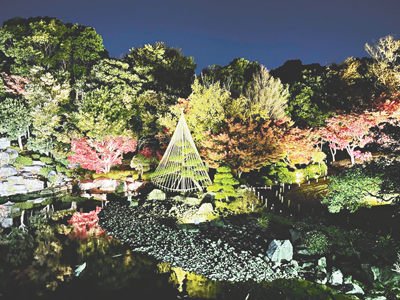 花畑記念庭園・桜花亭11月下旬と12月初旬、紅葉ライトアップが行われる。水面に生える「さかさモミジ」や「雪吊り」は幻想的で、例年、写真愛好家にも家族連れにも好評。暖かくして出かけてみては?