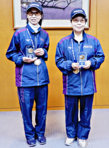 1月10日(火)に近藤やよい区長を訪ね、結果報告を行った。2人には記念の盾が贈られた。12年前に突発性視神経炎で視力を失い、その1年後にこの競技を始めた原さんは「自分の生きがいと希望になった卓球で、こんな賞を獲得出来てうれしい。あきらめないでやって良かった」、山中さんは「61歳で友人に勧められてこの競技を始め、この結果につながった。良かった」と語った。