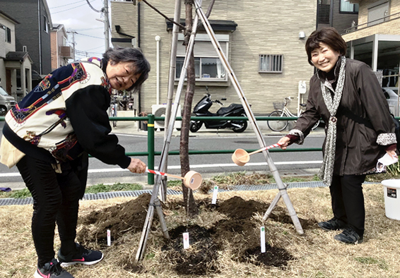「花と名を堤に残し永遠の世に」とメッセージした池上邦子さん(保木間5丁目)は「コロナの時にもらったお金の一部を寄付しました。自然が広がるのはうれしい」と話した。