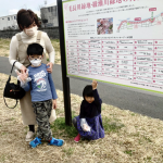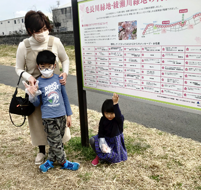 70本のうち下流の38本は寄附を原資にして植えられたもので、2カ所の桜配置案内板に2万円以上の寄付をした区民のメッセージが掲載された。長男の健ちゃん(桜花小1年)と千歳ちゃん(3歳)を連れて水やりに来た橋本法恵さん(花畑6丁目)は、夫の敏さんと連名で「しっかり進んで素敵で楽しい人になれますように」とメッセージ。「家の近くに桜の名所が出来るなんてうれしいです」と満面の笑みを浮かべた。